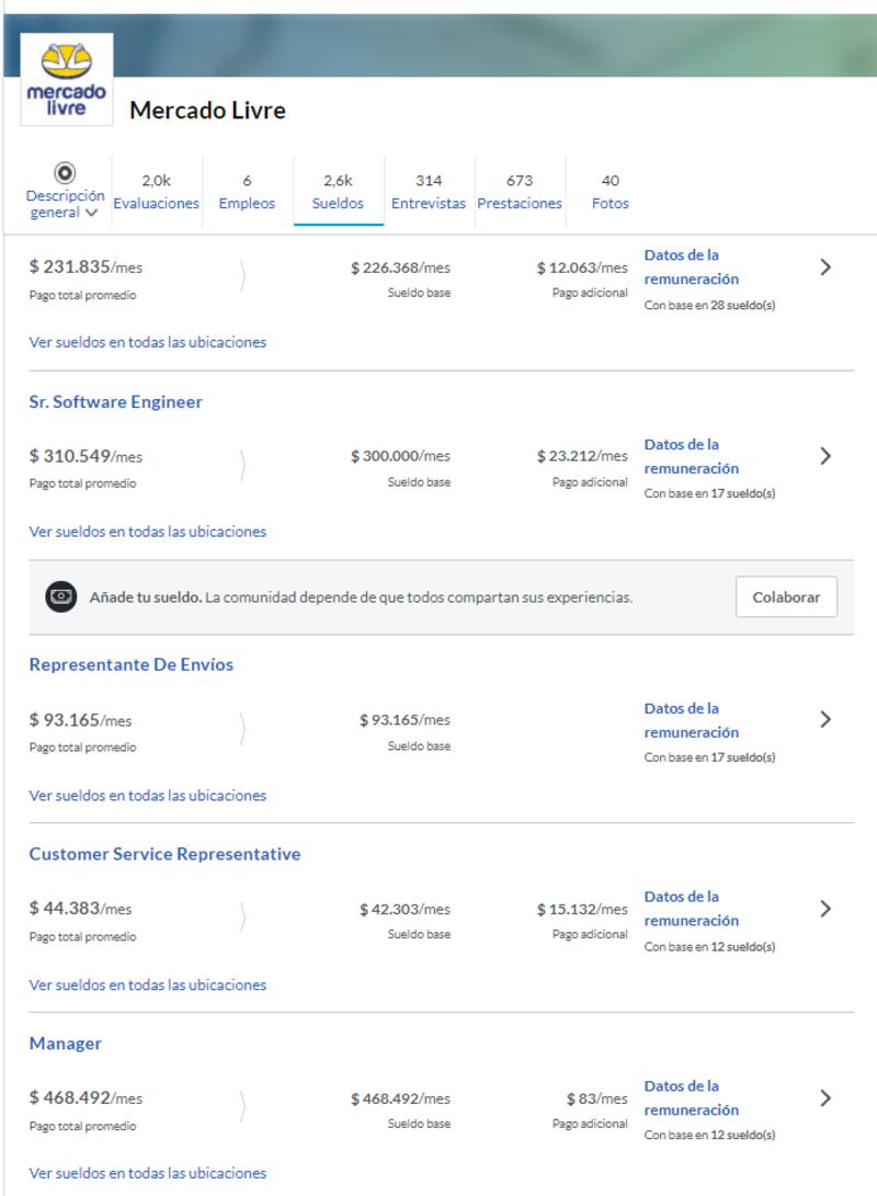 Según Glassdoor, una plataforma que recopila sueldos anónimos de empleados de empresas, un desarrollador en Mercado Libre ronda los $ 159.000 al mes; un ingeniero de software oscila entre los $ 230.000 y los $ 310.000; y el sueldo promedio de un analista es de $ 127.000 al mes.