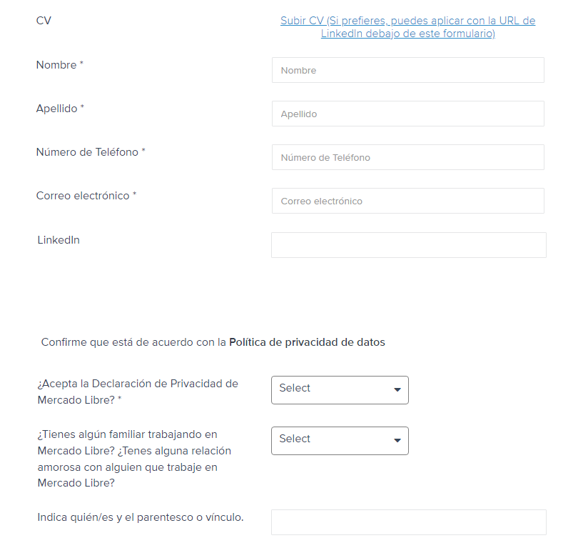 Paso seguido, la página redireccionará a la persona para que llene un formulario con currículum, nombre, apellido, número de teléfono, correo electrónico y cuenta de LinkedIn.