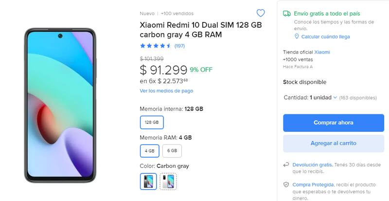 En línea con la gama media, Mercado Libre también ofrece el Xiaomi Redmi 10 de 128 GB en color "carbon grey" por un precio de $ 91.299. Una gran ventaja es que los consumidores podrán acceder a un envío gratuito para cualquier parte del país.