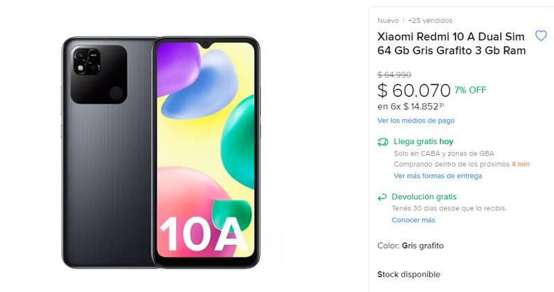 En Mercado Libre, el Xiaomi Redmi 10 A se encuentra a $ 60.070 y también ofrece la posibilidad de realizar el pago en cuotas.
