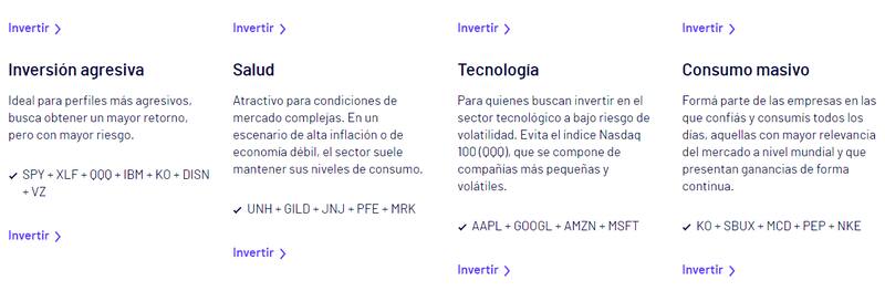 En su página web, Invertir Online ofrece una opción financiera llamada "Portafolios" que se basa en paquetes compuestos por un conjunto de CEDEARs, Obligaciones Negociables o Acciones que pueden comprarse de forma rápida y sencilla.