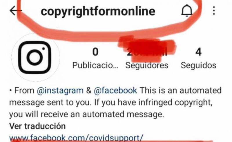 El mensaje dice: "Hola, usuario de Instagram, hemos recibido muchas quejas sobre tu cuenta deseamos informártelo antes de eliminar tu cuenta, algunas de las publicaciones van en contra de las pautas de nuestra comunidad respecto de los derechos de autor. Si crees que la infracción de derechos de autor es falsa, hace tu devolución. De lo contrario, tu cuenta se eliminará permanentemente de la plataforma en 72 horas".