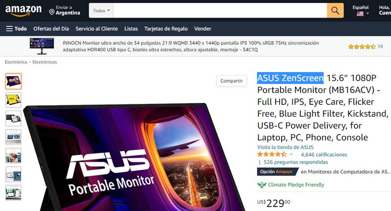 Por último, es posible comprar sin el recargo del 25% un monitor portatil ASUS ZenScreen de 15,6 pulgadas -el cuál se puede conectar con computadoras, celulares e incluso consolas- gracias a su precio de u$s 229.
