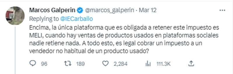 Por la normativa actual, la única plataforma obligada a retener el tributo es Mercado Libre. Así lo señaló su cofundador Marcos Galperin en Twitter, refiriéndose a la resolución 3411/2012, a partir de la cual, la alícuota de IVA se establecía entre el 1% y el 21% del valor publicado, según la condición fiscal del vendedor.