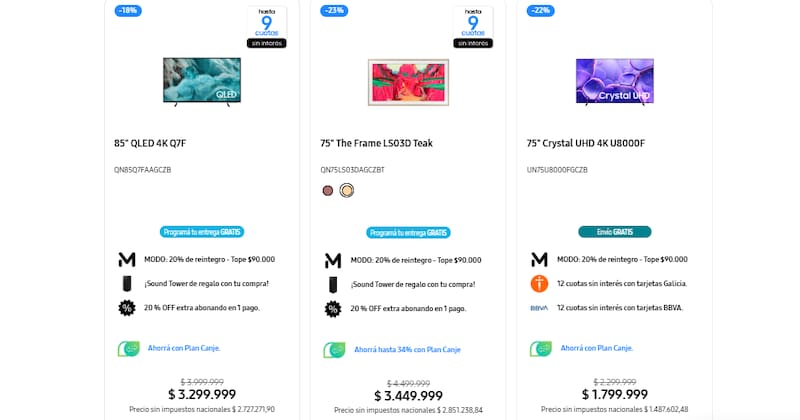 - 43″ Neo QLED 4K QN90D: $ 1.999.999. Hasta 36% de descuento con Plan Canje.
