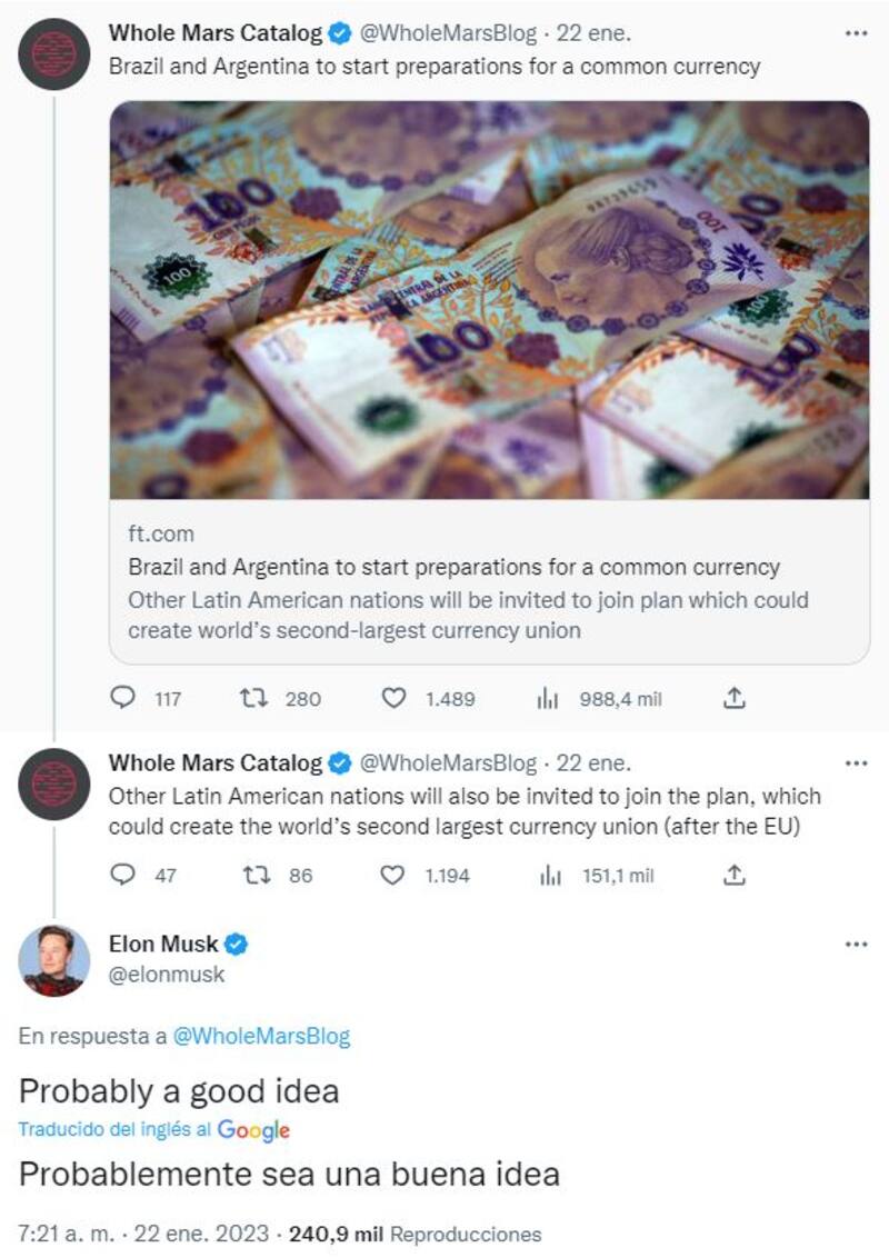 En alusión a un hilo de su red social donde se citaba una noticia del Financial Times, Musk se mostró optimista respecto del proyecto. En la nota se contaba el plan de los mandatarios de ambos países y una posible apertura hacia todo el Mercosur. El hilo puntualizaba los preparativos de ambas naciones y remarcaba que se iba a ampliar a otros estados latinos.