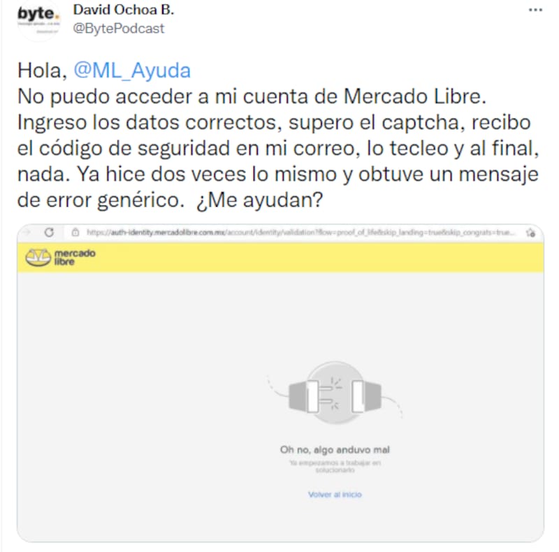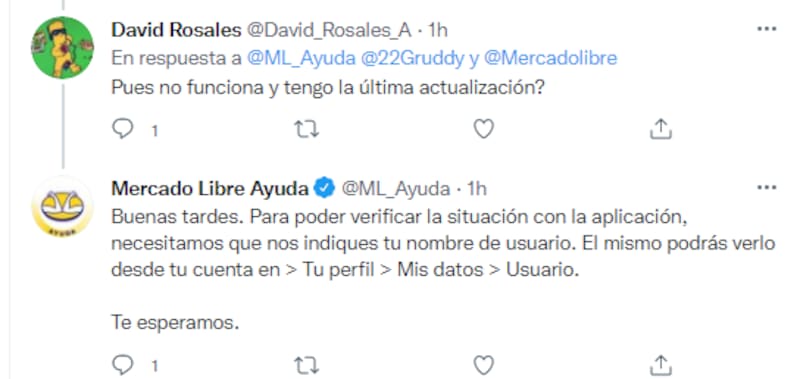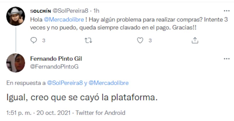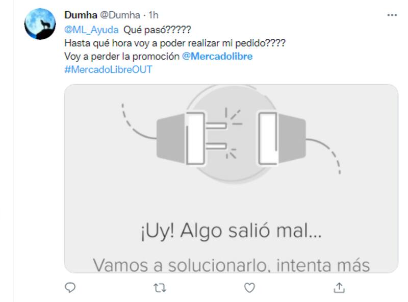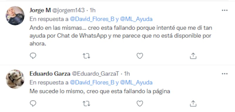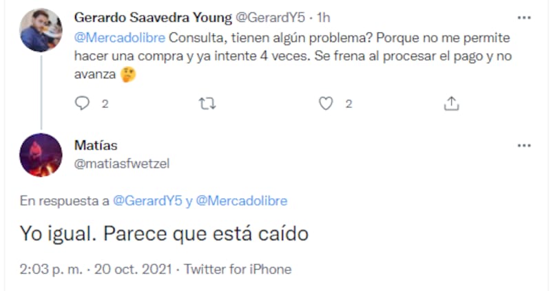 En Twitter, los usuarios de Mercado Libre reaccionaron y le preguntaron a la cuenta oficial de la empresa si la plataforma se encontraba caída o estaba sufriendo algún tipo de incidente:
