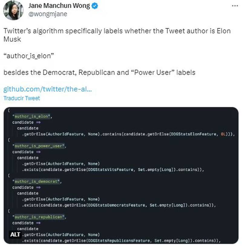 Jane Mncahung Wong, una reconocida hacker, detectó nuevas funciones en el algoritmo de Twitter a través de etiquetas como "demócrata", "republicano" o "usuario avanzado". Mientras que hay una especial para su CEO ("autor_is_elon").