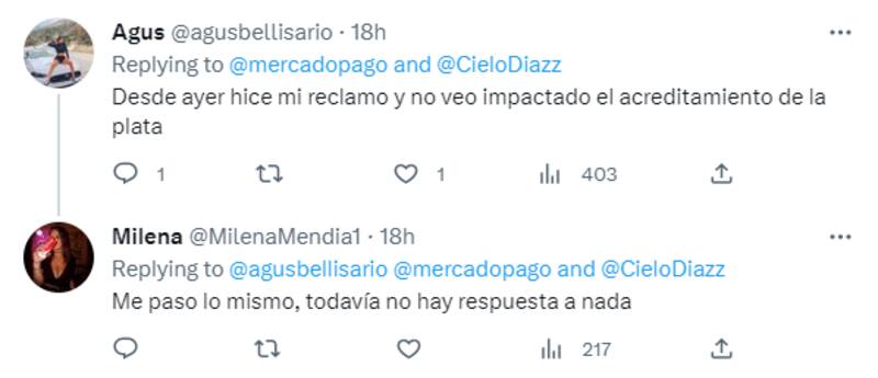 "No me llegan las transferencias bancarias a mi cuenta de @mercadopago hace de ayer!!!! A alguien más le está pasando lo mismo??", escribió una usuaria en Twitter, a lo que otros perfiles se sumaron e incluso señalaron que no recibieron respuesta a pesar de su reclamo.