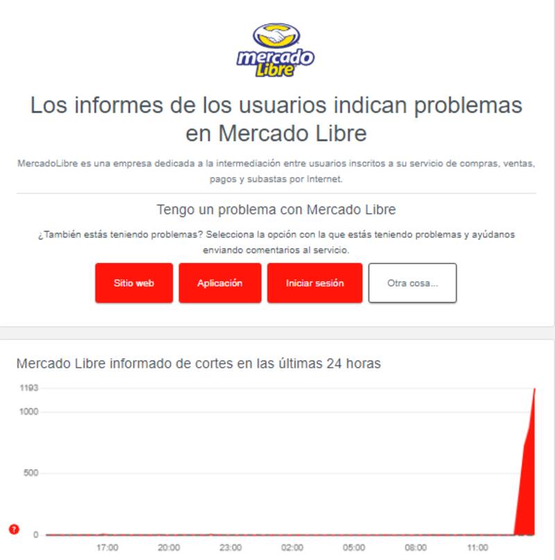 Uno de ellos es Down Detector, el cual especificó que los informes de los usuarios indican problemas en Mercado Libre en las últimas horas para ingresar a sus cuentas y utilizar sus servicios.