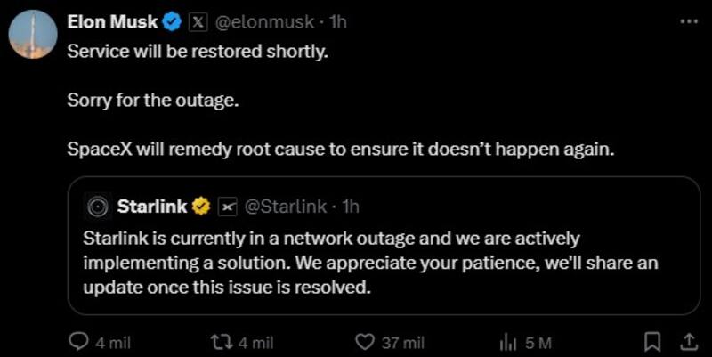 En un breve posteo, Musk les pidió disculpas a los usuarios. "El servicio se restablecerá en breve. Disculpen la interrupción. SpaceX solucionará la causa raíz para garantizar que no vuelva a suceder", afirmó.