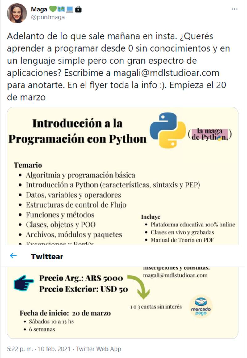 Por otro lado, recomendó los cursos introductorios de Python de "La Maga" (@printmaga). La fecha de inicio del próximo curso es el 20 de marzo y cuesta $5.000. La capacitación tiene una duración de seis semanas y está enfocada para personas con cero conocimientos.