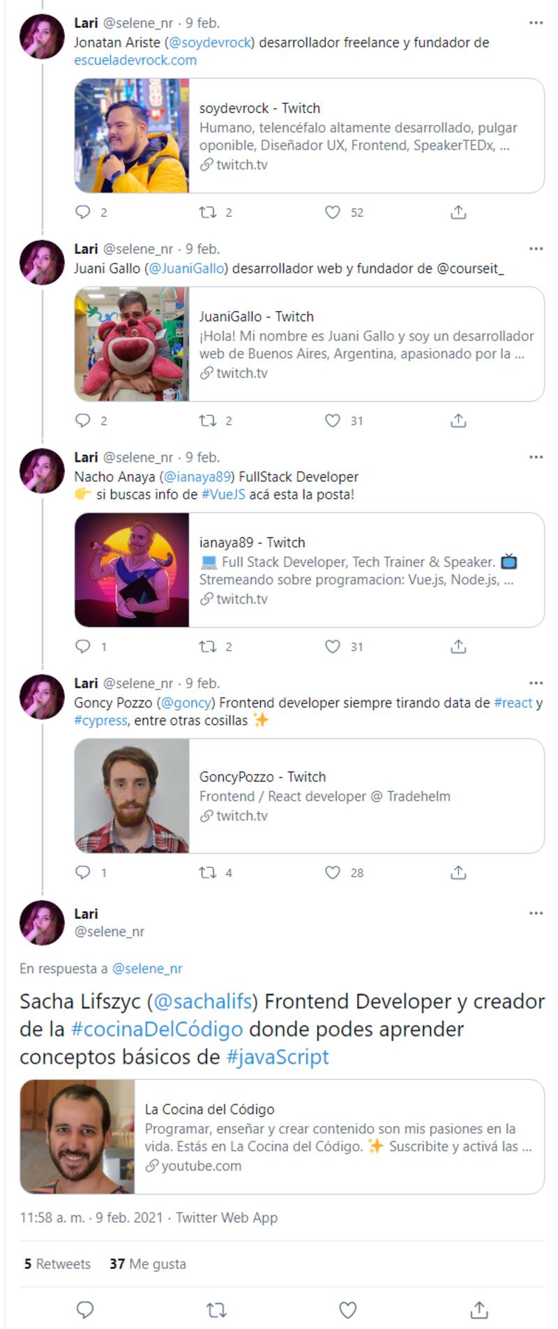 En primer lugar, Díaz (@selene_nr) enumeró streamers que utilizan sus plataformas para explicar contenidos básicos de informática como Jonatan Ariste, fundador de Escuela dev rock; Juani Gallo, fundador de CourseIT; el desarrollador full-stack Nacho Anaya; Goncy Pozzo; y el canal La Cocina del Código.