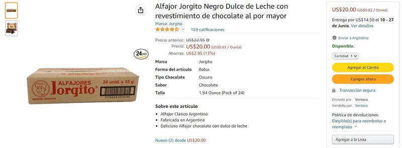 Por ejemplo, en Amazon se puede encontrar cajas de 24 alfajores por unos u$s 20 lo que en valor blue representa unos $ 4000. Mientras que en el mercado local se consiguen por entre $900 y $1200.