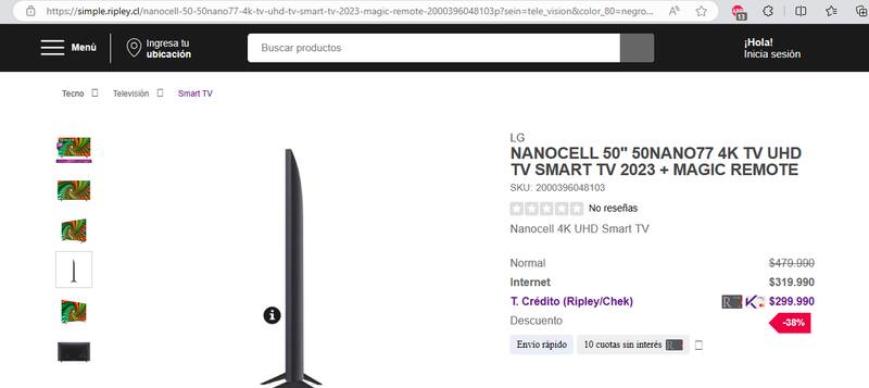 Una TV 50" Nanocell de LG cuesta $ 732.000 en Mercado Libre. Es 4K y tiene tecnología UHD. La misma TV en el retailer chileno Ripley (que usamos como barómetro) está 320.000 pesos chilenos. Es decir, poco más de $ 290.000 al cambio actual, o casi u$s 340. O sea, el precio es 60% inferior.