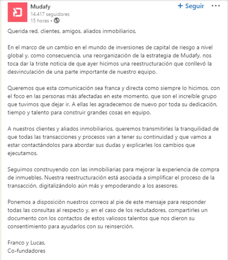 La empresa confirmó que en "el marco de un cambio en el mundo de inversiones de capital de riesgo a nivel global y, como consecuencia, una reorganización de la estrategia de Mudafy, nos toca dar la triste noticia de que ayer hicimos una reestructuración que conllevó la desvinculación de una parte importante de nuestro equipo".