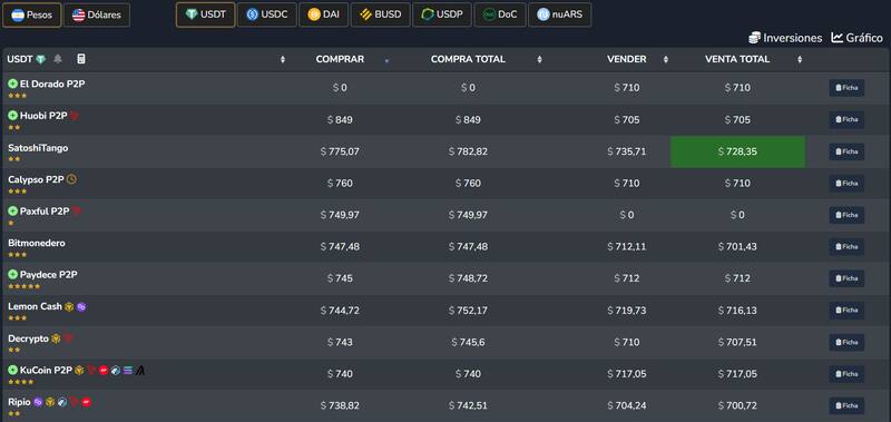 En dos exchanges de compras entre usuarios -P2P- el dólar cripto maneja precios de $ 717 y $ 176 respectivamente, lo que parece indicar que hay usuarios que están valorando el dólar -en su formato cripto - a un precio mucho más bajo de lo que lo hace el mercado del blue tradicional, en billete papel.