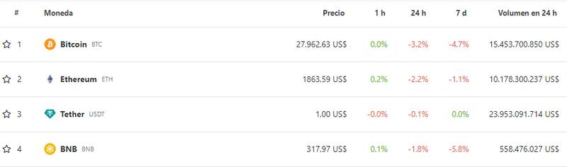 Mientras que la semana pasada Bitcoin superaba los u$s 29.000, hoy la criptomoneda estrella opera alrededor de los u$s 27.900, lo que supone una baja acumulada del 4,7% en los últimos 7 días.