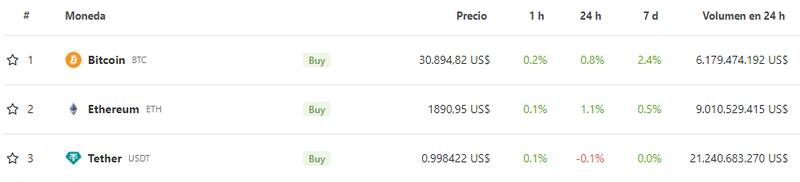 En línea con la tendencia de hace ya varios días, Bitcoin se negoció por encima de los u$s 30.000 y registró un leve aumento del 0,8% en 24 horas. Al momento de escribir esta nota, su precio se ubica en u$s 30.894,82.