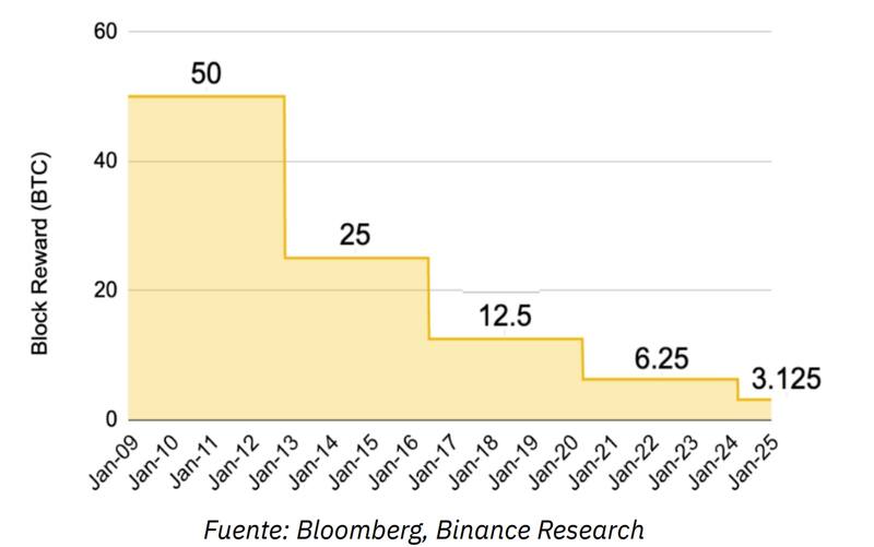 Dada la oferta máxima fija de BTC de 21.000.000 de unidades, la reducción a la mitad introduce una mayor escasez diseñada para aumentar su precio con el tiempo, reforzando su narrativa de BTC como "oro digital" o activo refugio. Cuando la cadena de bloques de Bitcoin se lanzó por primera vez en 2009, las recompensas por bloque comenzaron en 50 BTC. Tras posteriores reducciones a la mitad en 2012, 2016 y 2020, la recompensa actual es de 6,25 BTC por bloque. Se espera que la próxima reducción a la mitad ("halving") ocurra en abril de 2024, después de esto la recompensa por bloque será de 3,125 BTC.