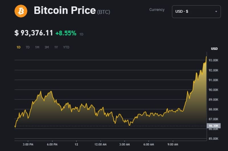 Con una suba cercana al 9% en las últimas 24 horas, Bitcoin (BTC) se posiciona en torno a u$s 93.376. A la par, el mercado augura por una prolongación de esta racha alcista.