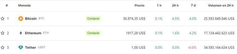 Bitcoin (BTC), la criptomoneda más antigua y popular del mercado, alcanzó un máximo de u$s 36.974, después de varias semanas consecutivas de cotizar alrededor de los u$s 35.000.