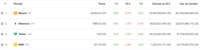 Este jueves a las 9:00 hs, Bitcoin (BTC) opera a u$s 29.004,54, según los datos del sitio Coingecko. De esta manera, la criptomoneda más importante del mercado se redujo por un 0,1 % en 24 horas.
