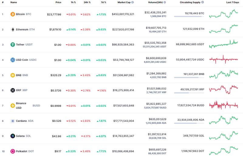 Según la información de CoinMarketCap, la cotización de BTC bajó un 3,6% durante el último día para dejar su precio en el rango de los u$s 23.700. Ethereum (ETH) tuvo rendimiento similar con una baja del 2,3% en las últimas 24 horas que dejó al activo con una cotización en los u$s 1880.