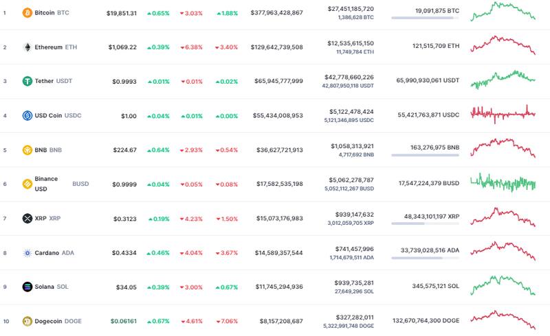 Según la información de CoinMarketCap, la cotización de BTC bajó un 3% para dejar su precio en el rango de los u$s 19.800. Ethereum (ETH) tuvo un rendimiento bastante peor al registrar una baja del 6,3% en las últimas 24 horas que dejó al activo con una cotización de u$s 1069.
