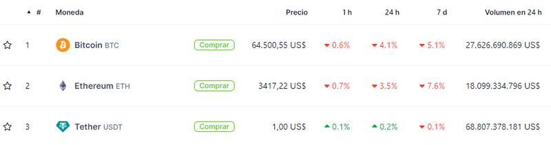 En concreto, la criptomoneda más antigua y popular del mercado registró una caída de precio de 4,1% en las últimas 24 horas; lo que se traduce en una cotización aproximada de u$s 64.500.