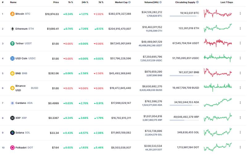 Según la información de CoinMarketCap, la cotización de BTC subió un 1,2% durante el último día para dejar su precio en el rango de losu$s 19.900. Por su parte, Ethereum (ETH) aumentó un 7,2% en las últimas 24 horas para dejar su precio a nada de los u$s 1700.
