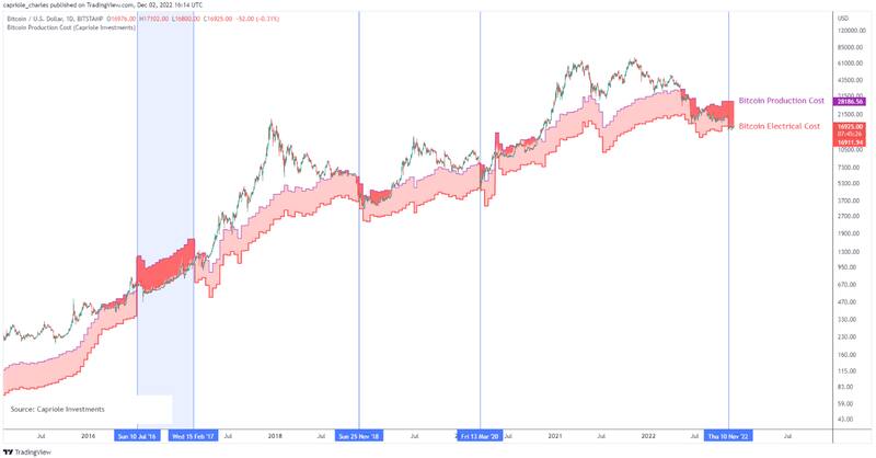 Históricamente, el costo eléctrico bruto siempre le marca un piso a Bitcoin porque es anti económico que opere por debajo de este punto de precio. Históricamente, Bitcoin solo ha cotizado por debajo del costo de la electricidad cuatro veces, la más reciente fue el 10 de noviembre, cuando el costo de la electricidad de Bitcoin alcanzó los u$s 16.925.