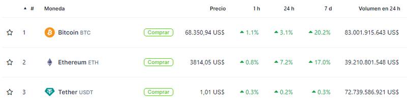Justo después de tocar el valor cúlmine, sin embargo, BTC se desinfló y pasó a ubicarse alrededor de los u$s 68.000; como en la jornada de ayer. El volumen de comercio de BTC, por su parte, es de u$s 82.077.878.819; esto indica un aumento de más del 50% en las últimas 24 horas y señala grandes niveles de actividad en el mercado.