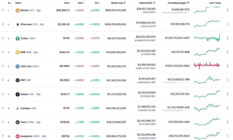 En el caso de BTC (el activo más importante del mercado) no se vio una variación importante -cambió solo 0,04% en las últimas 24 horas-, pero el hecho de que su precio se haya mantenido en los u$s 47.000 ya es una muy buena señal.