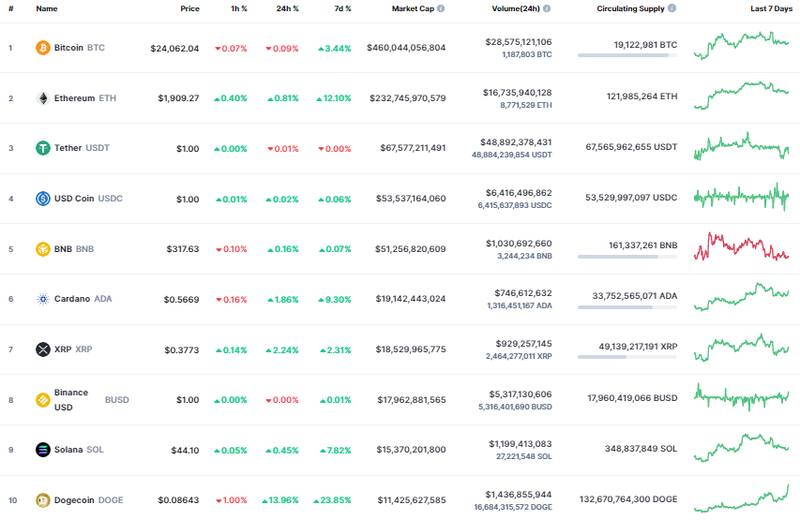 Bitcoin (BTC) abre la semana planchado y con su precio en el rango de los u$s 24.000, mientras que el resto de las criptomonedas registra rendimientos similares de entre 2% y 5% arriba en las últimas 24 horas.