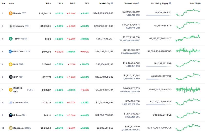 Según la información de CoinMarketCap, la cotización de BTC bajó un 2,4% durante el último día para dejar su precio en el rango de los u$s 23.200. Ethereum (ETH) tuvo rendimiento similar con una caída del 2,9% en las últimas 24 horas que dejó al activo con una cotización al borde de los u$s 1660.