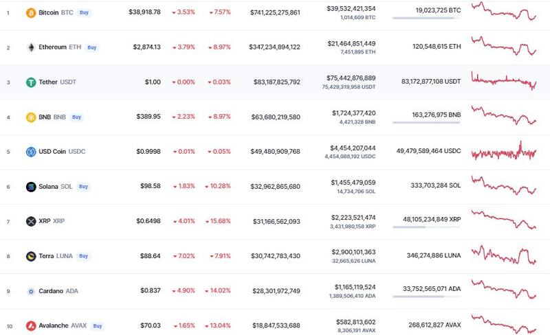 Según la información de CoinMarketCap, la cotización del BTC bajó un 3,5% durante el último día para llegar a un valor de u$s 39.000. Ethereum (ETH) tuvo un rendimiento similar, con una variación negativa del 3,7% en las últimas 24 horas que dejó al activo con una cotización por debajo de los u$s 2800.