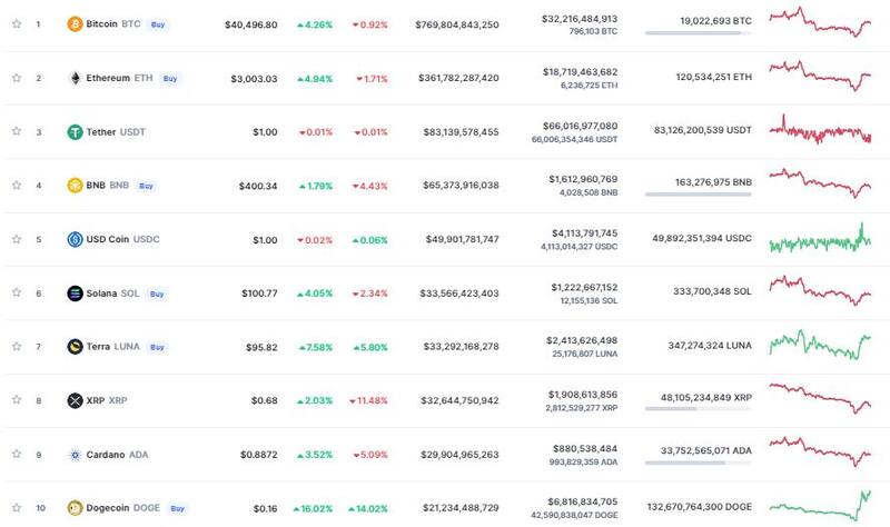 Según la información de CoinMarketCap, la cotización del BTC subió un 4,2% durante el último día para llegar a un valor de u$s 40.000. Ethereum (ETH) tuvo un rendimiento similar, con una variación positiva del 4,9% en las últimas 24 horas que dejó al activo con una cotización por debajo de los u$s 3000.