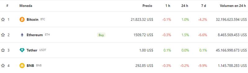 Si bien Bitcoin mantiene el puesto número uno como la criptomoneda más importante del mercado, el token se debilitó enormemente en los últimos días, cuando pasó de una cotización de casi u$s 24.000 a los actuales u$s 21.823,32.