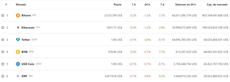 Si bien Bitcoin (BTC) mantiene su puesto como la criptomoneda más comercializada del mercado, también registró una baja en su cotización. Concretamente, el precio del token su ubica en u$s 23.537,99, lo que significa que el valor se enfrió por 1,2% en 24 hs.