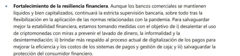 El reciente acuerdo técnico de la Argentina con el FMI tiene un apartado especial donde se crítica duramente a las criptomonedas. En la página 19, el último punto del apartado se refiere a las llamadas "Políticas de crecimiento y resiliencia", señala: "Para salvaguardar mejor la estabilidad financiera, estamos tomando medidas con el objetivo de desalentar el uso de criptomonedas con miras a prevenir el lavado de dinero, la informalidad y la desintermediación".