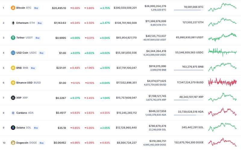 Según la información de CoinMarketCap, la cotización de BTC bajó un 3,8% para dejar su precio en el rango de los u$s 20.500. Ethereum (ETH) tuvo un rendimiento similar al registrar una baja del 3,5% en las últimas 24 horas que dejó al activo con una cotización de u$s 1140.