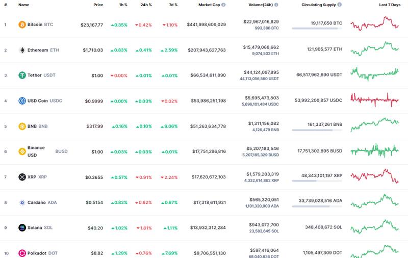 Según la información de CoinMarketCap, la cotización de BTC bajó un 0,4% durante el último día para dejar su precio en el rango de los u$s 23.100. Ethereum (ETH) tuvo rendimiento similar con una suba del 0,4% en las últimas 24 horas que dejó al activo con una cotización al borde de los u$s 1700.