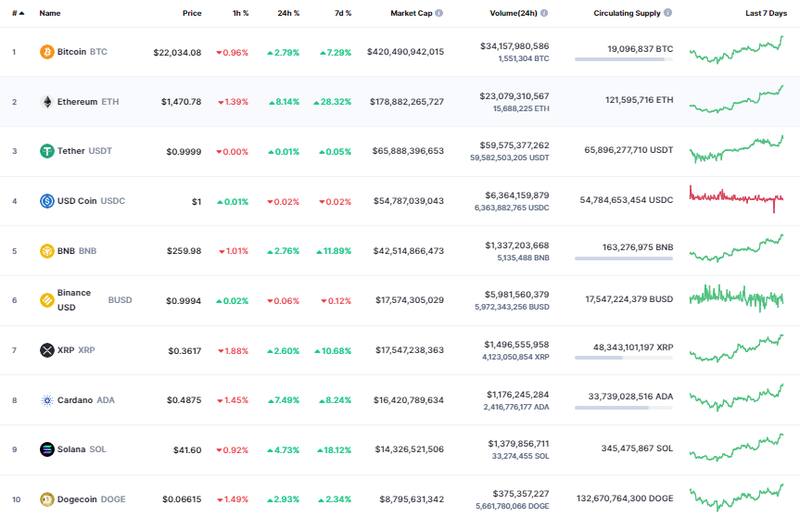 Según la información de CoinMarketCap, la cotización de BTC subió un 2,7% para dejar su precio en el rango de los u$s 22.000. Ethereum (ETH) tuvo un rendimiento mejor al registrar una suba del 8,1% en las últimas 24 horas que dejó al activo con una cotización de u$s 1400.