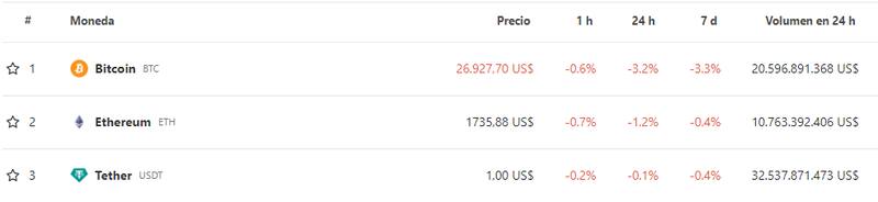 Concretamente, el token se ubica en u$s 26.927,70 y acumula una baja del 3,3% en la última semana. Es un panorama muy diferente al de hace una semana, cuando Bitcoin rozaba los u$s 28.000 y fomentaba las esperanzas de un posible "bull run".