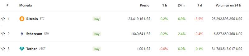 En el ranking de las criptomonedas más comercializadas, Bitcoin (BTC) mantiene el puesto número uno. Sin embargo, este activo no logra superar la marca de los u$s 24.000 que veía a mediados de febrero. En cambio, hoy cotiza a u$s 23.419,16.