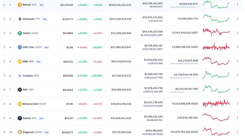 Bitcoin (BTC) abre la semana en verde y nuevamente con una cotización por encima de los u$s 31.000, mientras que el resto de las criptomonedas siguen a al token con subidas similares de entre el 2% y el 11% en las últimas 24 horas.