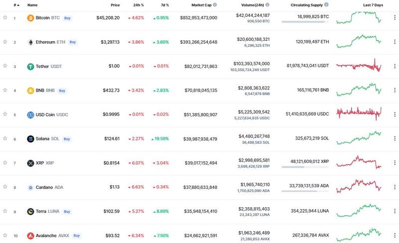 Según la información de CoinMarketCap, BTC (el activo más importante del mercado) cayó un 4,65% en las últimas 24 horas, lo que representa la primera bajada importante de este activo en la semana y que posiciona su valor en u$s 45.000. La situación con Ethereum(ETH) es similar, con la criptomoneda cayendo un 4,02% en las últimas 24 horas y dejando al activo con un valor de u$s 3296.