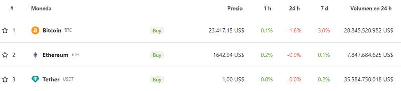 Bitcoin (BTC), la moneda más comercializada del mercado, no logró mantener sus números en alza. Mientras que ayer mostraba gran resistencia frente a las ofensivas de los reguladores, hoy tambalea y ubica su precio en torno a los u$s 23.415,93.