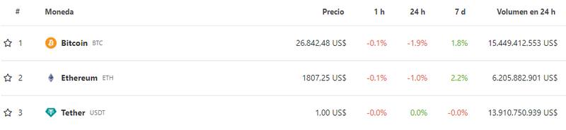 Al momento de escribir esta nota, BTC cotiza a u$s 26.842,48, lo que se traduce en una caída del 1,9% en 24 horas. Sin embargo, en la última semana, el token acumula una suba del 1,8%.